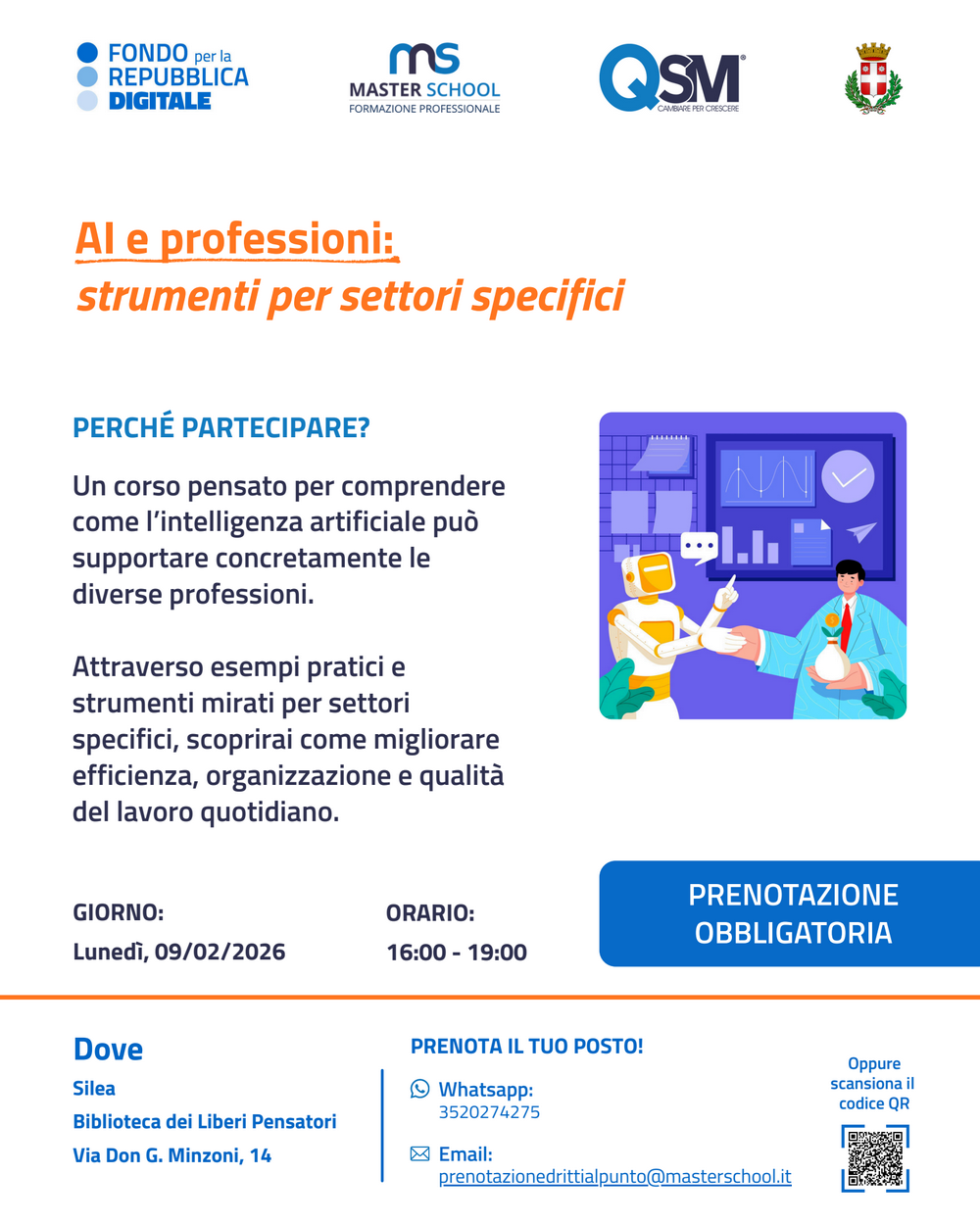 Un corso pensato per comprendere come l'intelligenza artificiale può supportare concretamente le diverse professioni, oggi lunedì 9 febbraio 2026, dalle ore 16:00 alle ore 19:00, biblioteca di Silea.