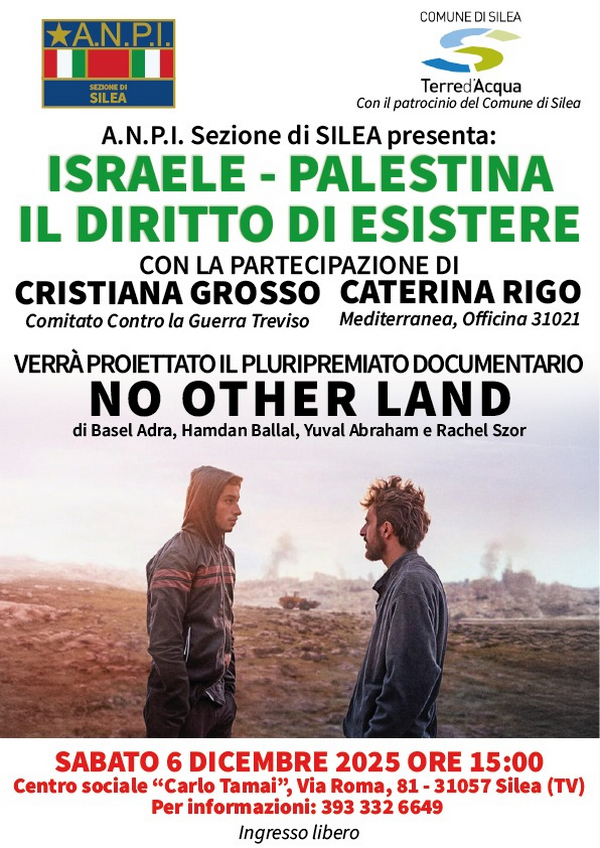 L'A.N.P.I. Sezione di Silea, con il patrocinio del Comune di Silea, invita la cittadinanza a un pomeriggio di approfondimento e dialogo sul tema dei diritti e della convivenza in Medio Oriente, con la proiezione del pluripremiato documentario “No Other Land”, di Basel Adra, Hamdan Ballal, Yuval Abraham e Rachel Szor: un’opera intensa che racconta da vicino le realtà umane del conflitto e la lotta per la propria terra.