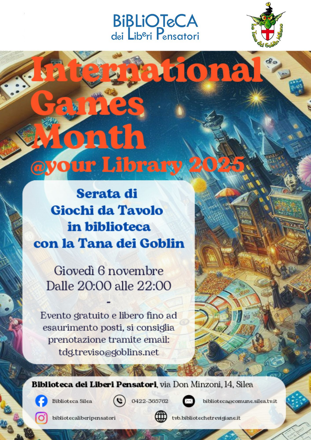 All’interno della Rassegna Gaming “La Biblioteca Incantata” - incontri mensili di gioco da tavolo e di ruolo - la Biblioteca dei Liberi Pensatori di Silea aderisce all’International Games Month @your Library 2025, l’iniziativa mondiale promossa dall’American Library Association (ALA) e dall’Associazione Italiana Biblioteche (AIB), che ogni novembre trasforma le biblioteche in spazi e occasioni di incontro e divertimento sposando il valore educativo, sociale e culturale del gioco.
