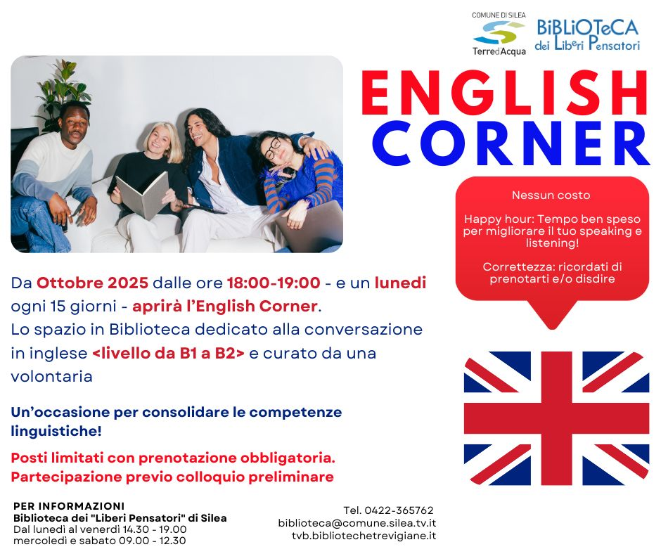 A partire da lunedì 13 ottobre, dalle 18:00 alle 19:00, prende il via "English Corner" pensato per chi vuole migliorare il proprio inglese in modo semplice e informale.